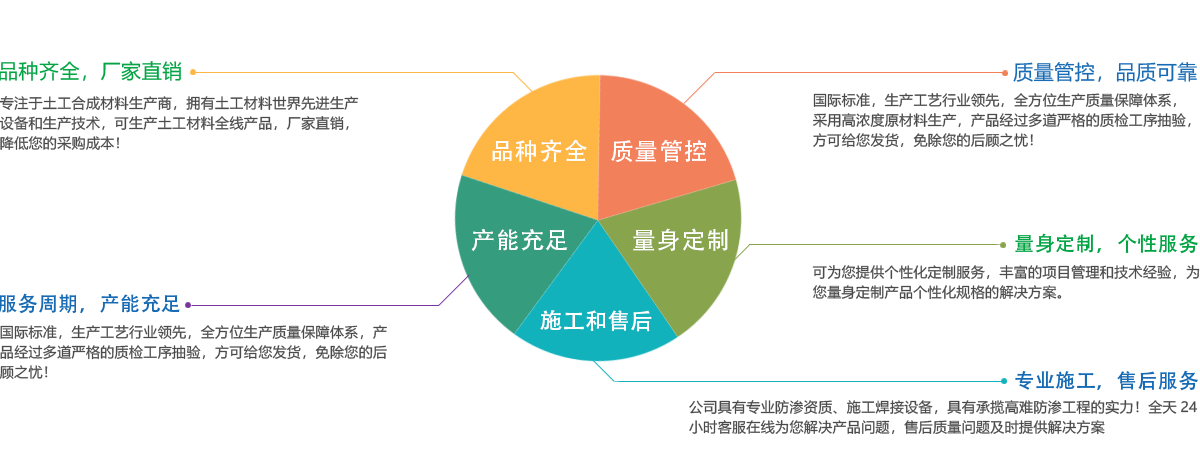公司所有產(chǎn)品均采用國(guó)際標(biāo)準(zhǔn)組織生產(chǎn),并經(jīng)國(guó)家、市技術(shù)監(jiān)督局采標(biāo)驗(yàn)收,生產(chǎn)工藝及水平全國(guó)領(lǐng)先,屬?lài)?guó)內(nèi)優(yōu)等水平,實(shí)物質(zhì)量達(dá)到國(guó)際先進(jìn)水平。經(jīng)用戶、施工單位使用證明,質(zhì)量穩(wěn)定可靠、施工方便、價(jià)格合理、售后服務(wù)完善。產(chǎn)品主要應(yīng)用于農(nóng)業(yè)、海綿城市建設(shè)、公路、鐵路、垃圾填埋場(chǎng)防滲,水利、電力、水土保持及環(huán)境綠化與基礎(chǔ)建設(shè)領(lǐng)域,已被廣泛應(yīng)用于高速公路、鐵路、垃圾填埋場(chǎng)等多項(xiàng)國(guó)家重點(diǎn)工程,受到工程界專(zhuān)家及廣大用戶的一致好評(píng)。
